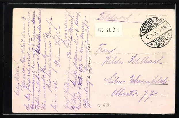 alte Ansichtskarte, gelaufen 1915, rückseitig Klebe- und Papierreste, guter Zustand