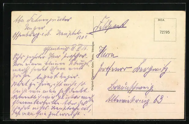 Personenbezogene Daten auf der Rückseite der Karte wurden durch blauen Textmarker unkenntlich gemacht. Die blauen Stellen sind auf die Vorderseite durchgeweicht und wirken sich negativ auf das Postkartenfoto aus