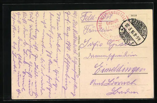Personenbezogene Daten auf der Rückseite der Karte wurden durch blauen Textmarker unkenntlich gemacht. Die blauen Stellen sind auf die Vorderseite durchgeweicht und wirken sich negativ auf das Postkartenfoto aus