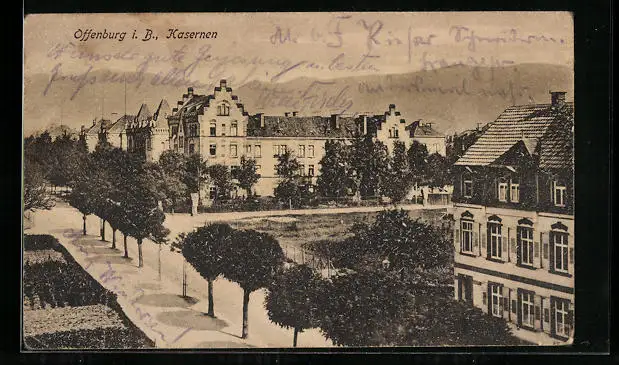 AK Offenburg i. B., Strassenpartie mit Kasernen