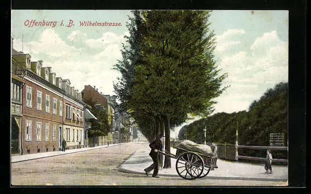 AK Offenburg i. B., Wilhelmstrasse, Mann mit Handkarren