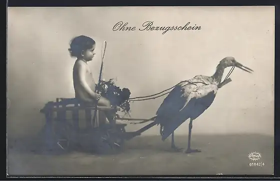 AK Ohne Bezugsschein, Kind im Bollerwagen mit Klapperstorch