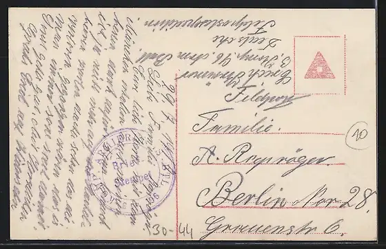 Personenbezogene Daten auf der Rückseite der Karte wurden durch blauen Textmarker unkenntlich gemacht. Die blauen Stellen sind auf die Vorderseite durchgeweicht und wirken sich negativ auf das Postkartenfoto aus