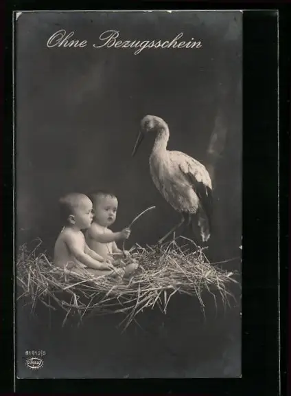 AK Ohne Bezugsschein, Klapperstorch mit zwei Babys im Nest