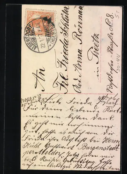 Personenbezogene Daten auf der Rückseite der Karte wurden durch blauen Textmarker unkenntlich gemacht. Die blauen Stellen sind auf die Vorderseite durchgeweicht und wirken sich negativ auf das Postkartenfoto aus