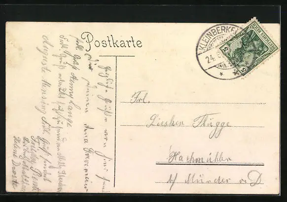 Personenbezogene Daten auf der Rückseite der Karte wurden durch blauen Textmarker unkenntlich gemacht. Die blauen Stellen sind auf die Vorderseite durchgeweicht und wirken sich negativ auf das Postkartenfoto aus