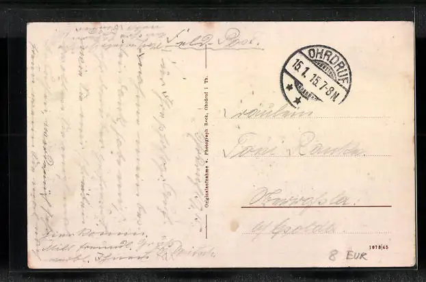 Personenbezogene Daten auf der Rückseite der Karte wurden durch blauen Textmarker unkenntlich gemacht. Die blauen Stellen sind auf die Vorderseite durchgeweicht und wirken sich negativ auf das Postkartenfoto aus