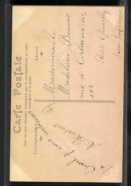 Personenbezogene Daten auf der Rückseite der Karte wurden durch blauen Textmarker unkenntlich gemacht. Die blauen Stellen sind auf die Vorderseite durchgeweicht und wirken sich negativ auf das Postkartenfoto aus