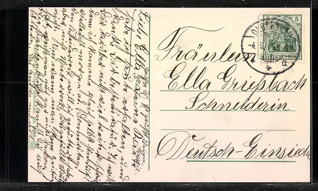 Personenbezogene Daten auf der Rückseite der Karte wurden durch blauen Textmarker unkenntlich gemacht. Die blauen Stellen sind auf die Vorderseite durchgeweicht und wirken sich negativ auf das Postkartenfoto aus
