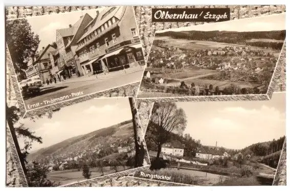Ansichtskarte Olbernhau Erzgeb. vier Abb., gestaltet Ernst-Thälmann-Platz, Teilansicht (2), Rungstocktal Erhaltung I ungelaufen Druckvermerk: 1965 Herstellungsland: DDR Verlag: Erhard Neubert KG, Karl-Marx-Stadt - A1690N