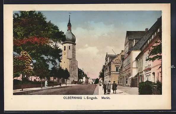 AK Olbernhau i. Erzgeb., Markt mit Geschäften und Kirche