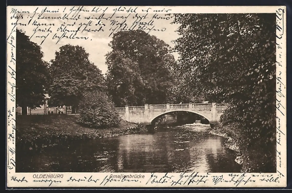 AK Oldenburg / O., Amalienbrücke mit Flusspartie