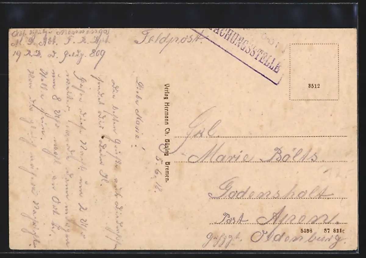 Personenbezogene Daten auf der Rückseite der Karte wurden durch blauen Textmarker unkenntlich gemacht. Die blauen Stellen sind auf die Vorderseite durchgeweicht und wirken sich negativ auf das Postkartenfoto aus