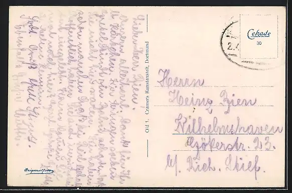 Personenbezogene Daten auf der Rückseite der Karte wurden durch blauen Textmarker unkenntlich gemacht. Die blauen Stellen sind auf die Vorderseite durchgeweicht und wirken sich negativ auf das Postkartenfoto aus