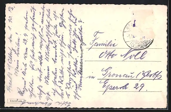 Personenbezogene Daten auf der Rückseite der Karte wurden durch blauen Textmarker unkenntlich gemacht. Die blauen Stellen sind auf die Vorderseite durchgeweicht und wirken sich negativ auf das Postkartenfoto aus