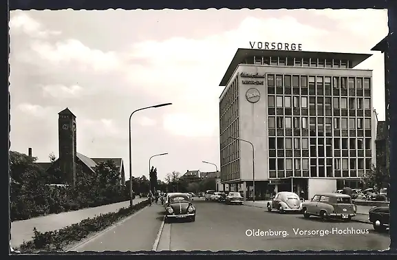 AK Oldenburg / O., Blick auf das Vorsorge-Hochhaus mit Autos