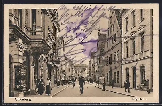 Personenbezogene Daten auf der Rückseite der Karte wurden durch blauen Textmarker unkenntlich gemacht. Die blauen Stellen sind auf die Vorderseite durchgeweicht und wirken sich negativ auf das Postkartenfoto aus