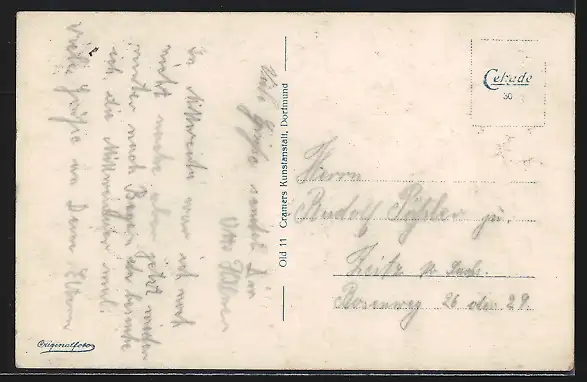 Personenbezogene Daten auf der Rückseite der Karte wurden durch blauen Textmarker unkenntlich gemacht. Die blauen Stellen sind auf die Vorderseite durchgeweicht und wirken sich negativ auf das Postkartenfoto aus