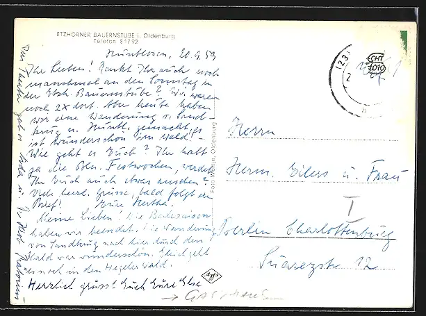 gelaufen 1959, Briefmarke entfernt, Eckknick li. oben, guter Zustand
