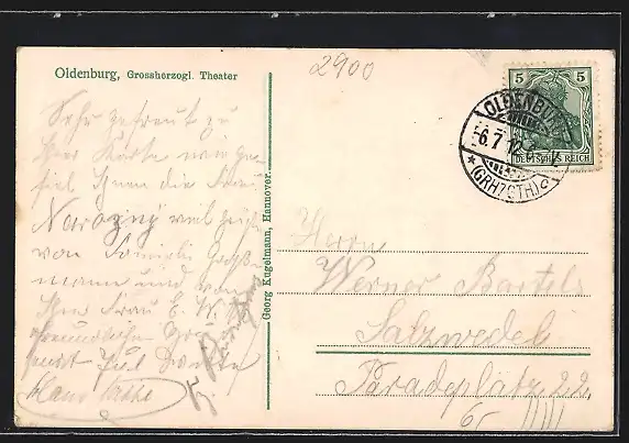 Personenbezogene Daten auf der Rückseite der Karte wurden durch blauen Textmarker unkenntlich gemacht. Die blauen Stellen sind auf die Vorderseite durchgeweicht und wirken sich negativ auf das Postkartenfoto aus