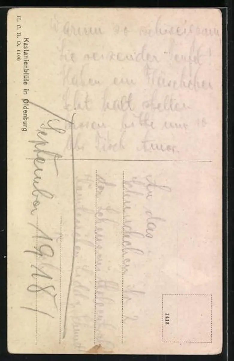 Personenbezogene Daten auf der Rückseite der Karte wurden durch blauen Textmarker unkenntlich gemacht. Die blauen Stellen sind auf die Vorderseite durchgeweicht und wirken sich negativ auf das Postkartenfoto aus