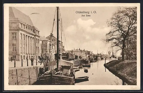 AK Oldenburg / O., Partie am Stau, Boote am Kai