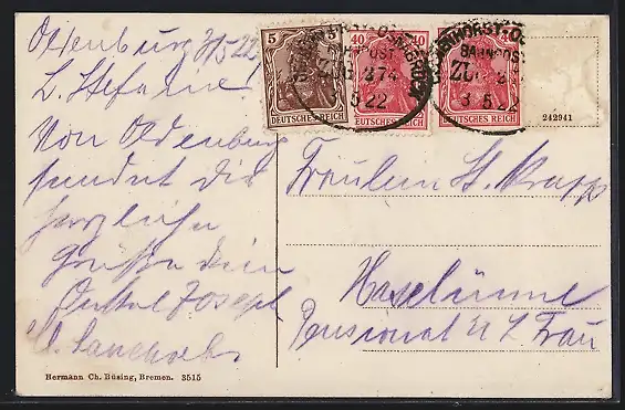 alte Ansichtskarte, gelaufen 1922, Briefmarke entfernt, guter Zustand