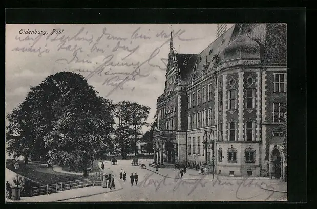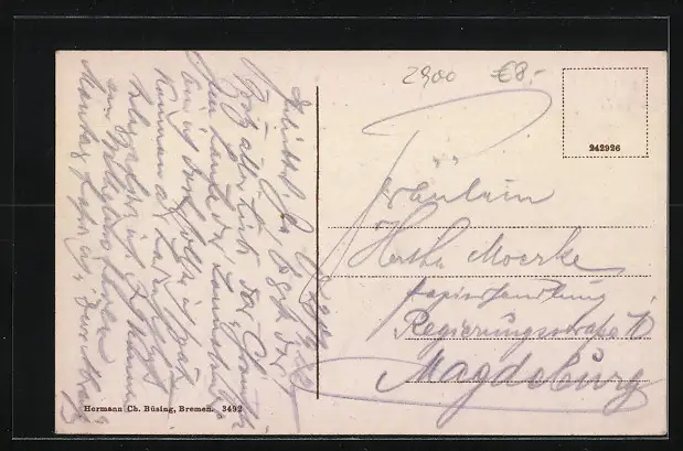 Personenbezogene Daten auf der Rückseite der Karte wurden durch blauen Textmarker unkenntlich gemacht. Die blauen Stellen sind auf die Vorderseite durchgeweicht und wirken sich negativ auf das Postkartenfoto aus
