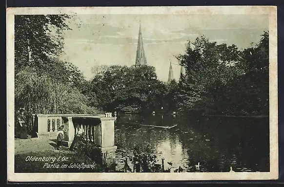 AK Oldenburg i. Gr., Schlosspark mit Kirchturm