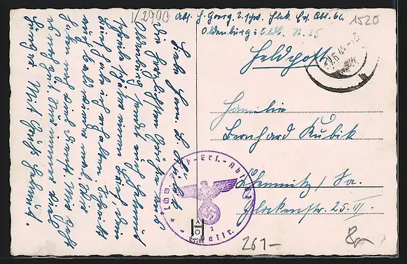 Personenbezogene Daten auf der Rückseite der Karte wurden durch blauen Textmarker unkenntlich gemacht. Die blauen Stellen sind auf die Vorderseite durchgeweicht und wirken sich negativ auf das Postkartenfoto aus