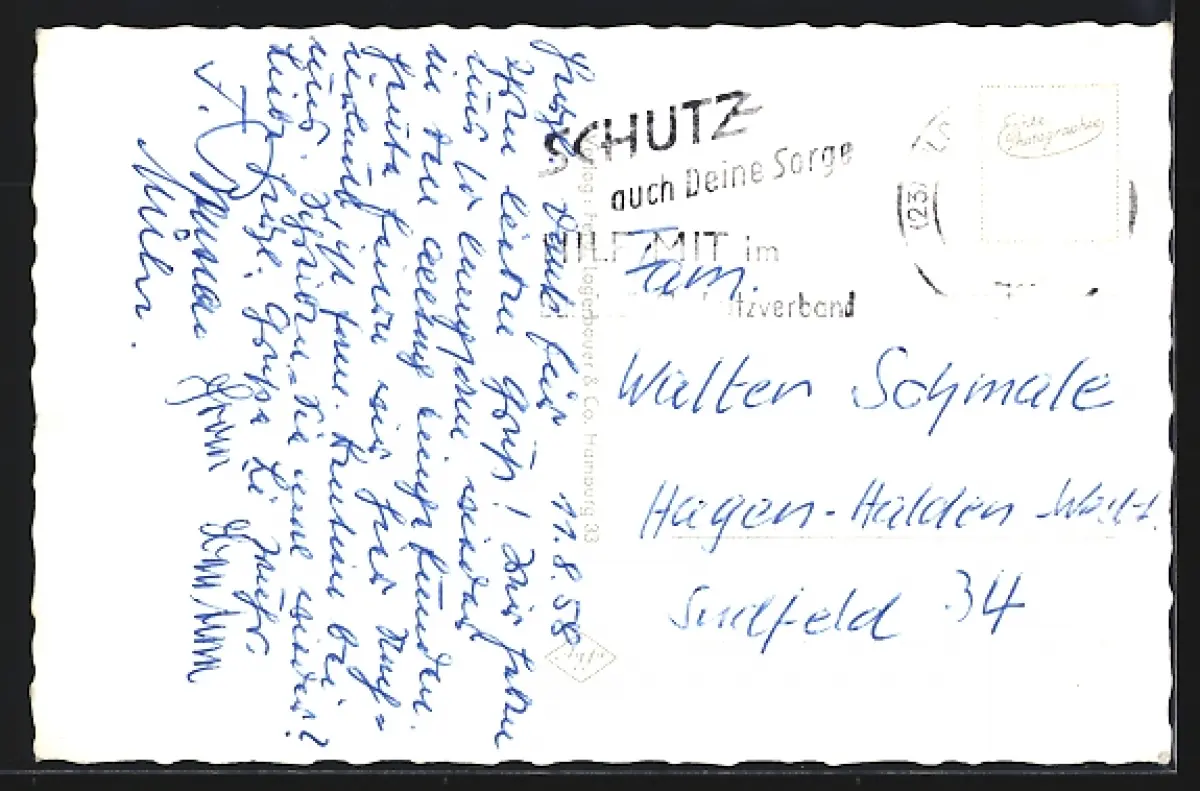 Personenbezogene Daten auf der Rückseite der Karte wurden durch blauen Textmarker unkenntlich gemacht. Die blauen Stellen sind auf die Vorderseite durchgeweicht und wirken sich negativ auf das Postkartenfoto aus
