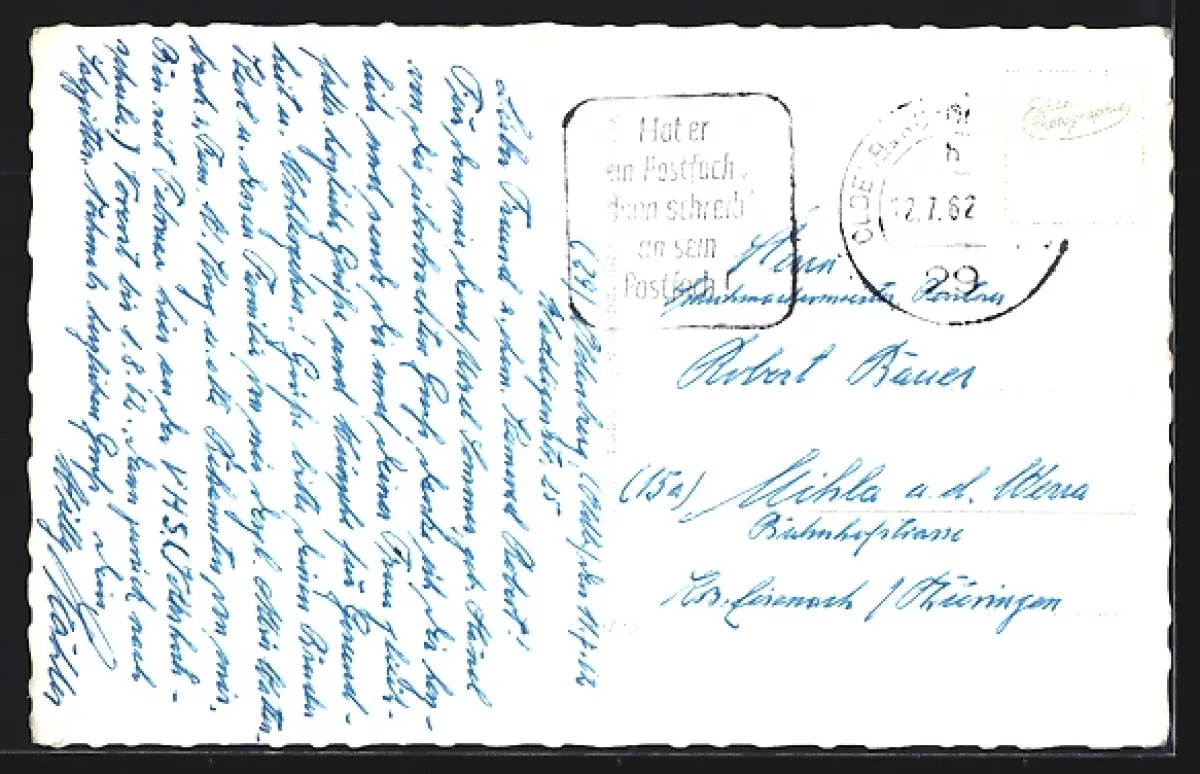 Personenbezogene Daten auf der Rückseite der Karte wurden durch blauen Textmarker unkenntlich gemacht. Die blauen Stellen sind auf die Vorderseite durchgeweicht und wirken sich negativ auf das Postkartenfoto aus
