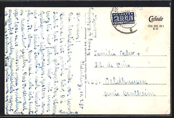 Personenbezogene Daten auf der Rückseite der Karte wurden durch blauen Textmarker unkenntlich gemacht. Die blauen Stellen sind auf die Vorderseite durchgeweicht und wirken sich negativ auf das Postkartenfoto aus