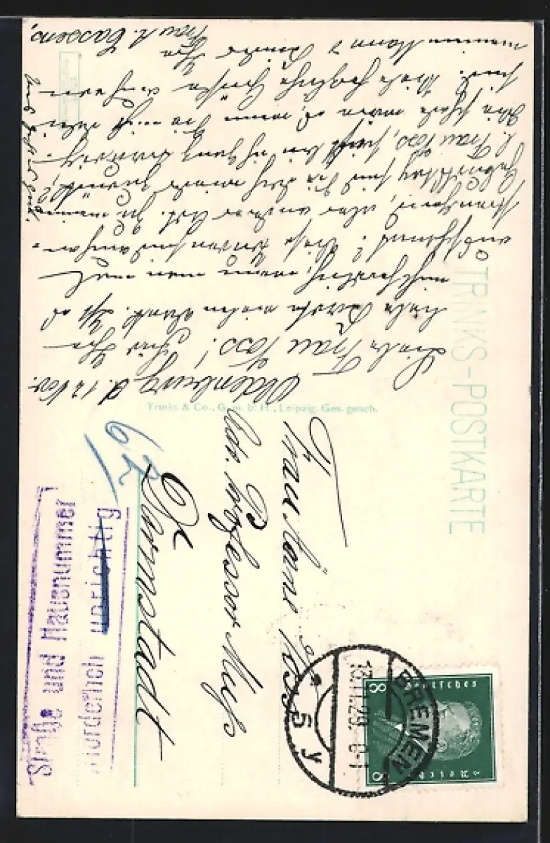 Personenbezogene Daten auf der Rückseite der Karte wurden durch blauen Textmarker unkenntlich gemacht. Die blauen Stellen sind auf die Vorderseite durchgeweicht und wirken sich negativ auf das Postkartenfoto aus
