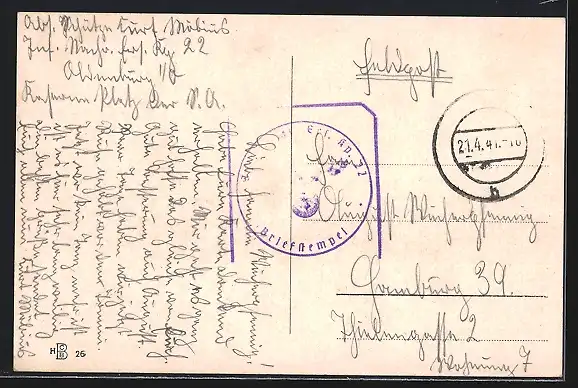 Personenbezogene Daten auf der Rückseite der Karte wurden durch blauen Textmarker unkenntlich gemacht. Die blauen Stellen sind auf die Vorderseite durchgeweicht und wirken sich negativ auf das Postkartenfoto aus