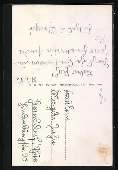 Personenbezogene Daten auf der Rückseite der Karte wurden durch blauen Textmarker unkenntlich gemacht. Die blauen Stellen sind auf die Vorderseite durchgeweicht und wirken sich negativ auf das Postkartenfoto aus