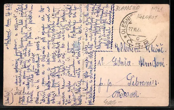 Personenbezogene Daten auf der Rückseite der Karte wurden durch blauen Textmarker unkenntlich gemacht. Die blauen Stellen sind auf die Vorderseite durchgeweicht und wirken sich negativ auf das Postkartenfoto aus