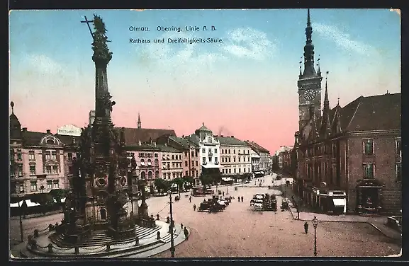 AK Olmütz, Dreifaltigkeitssäule u. Rathaus am Oberring