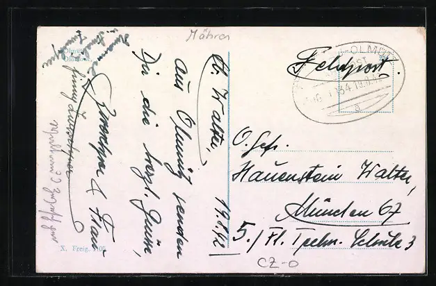 Personenbezogene Daten auf der Rückseite der Karte wurden durch blauen Textmarker unkenntlich gemacht. Die blauen Stellen sind auf die Vorderseite durchgeweicht und wirken sich negativ auf das Postkartenfoto aus