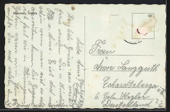 Personenbezogene Daten auf der Rückseite der Karte wurden durch blauen Textmarker unkenntlich gemacht. Die blauen Stellen sind auf die Vorderseite durchgeweicht und wirken sich negativ auf das Postkartenfoto aus