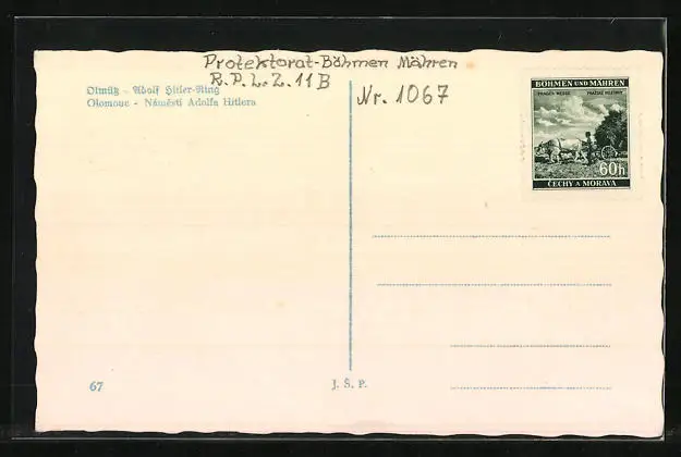 Personenbezogene Daten auf der Rückseite der Karte wurden durch blauen Textmarker unkenntlich gemacht. Die blauen Stellen sind auf die Vorderseite durchgeweicht und wirken sich negativ auf das Postkartenfoto aus
