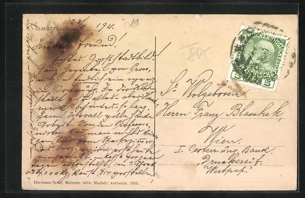 Personenbezogene Daten auf der Rückseite der Karte wurden durch blauen Textmarker unkenntlich gemacht. Die blauen Stellen sind auf die Vorderseite durchgeweicht und wirken sich negativ auf das Postkartenfoto aus