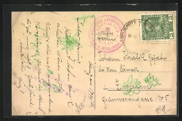 Personenbezogene Daten auf der Rückseite der Karte wurden durch blauen Textmarker unkenntlich gemacht. Die blauen Stellen sind auf die Vorderseite durchgeweicht und wirken sich negativ auf das Postkartenfoto aus
