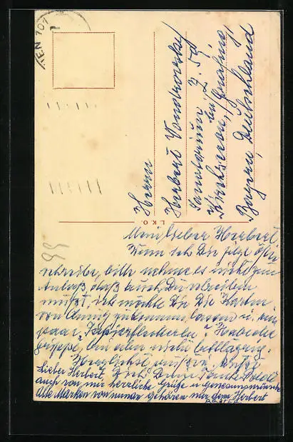 Personenbezogene Daten auf der Rückseite der Karte wurden durch blauen Textmarker unkenntlich gemacht. Die blauen Stellen sind auf die Vorderseite durchgeweicht und wirken sich negativ auf das Postkartenfoto aus