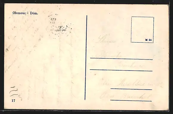 Personenbezogene Daten auf der Rückseite der Karte wurden durch blauen Textmarker unkenntlich gemacht. Die blauen Stellen sind auf die Vorderseite durchgeweicht und wirken sich negativ auf das Postkartenfoto aus
