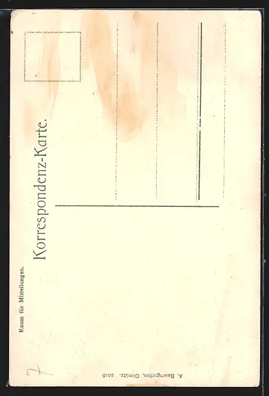 Personenbezogene Daten auf der Rückseite der Karte wurden durch blauen Textmarker unkenntlich gemacht. Die blauen Stellen sind auf die Vorderseite durchgeweicht und wirken sich negativ auf das Postkartenfoto aus