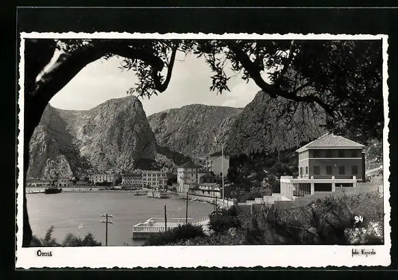 AK Omis, Teilansicht mit Hafen vor mächtigen Felsen