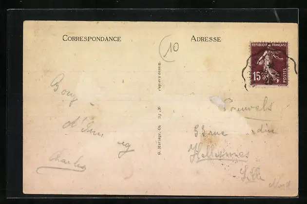 Personenbezogene Daten auf der Rückseite der Karte wurden durch blauen Textmarker unkenntlich gemacht. Die blauen Stellen sind auf die Vorderseite durchgeweicht und wirken sich negativ auf das Postkartenfoto aus
