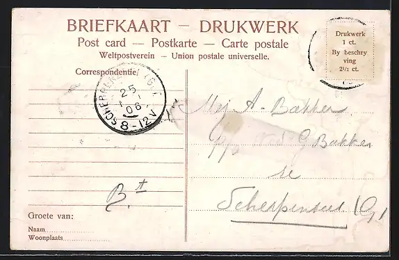gelaufen 1906, Briefmarke entfernt, guter Zustand