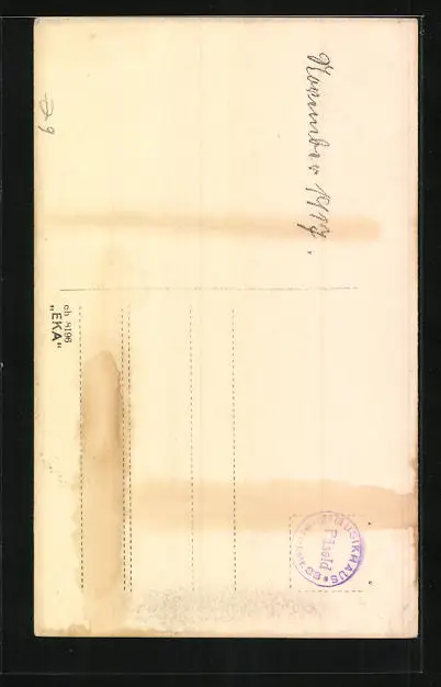 Personenbezogene Daten auf der Rückseite der Karte wurden durch blauen Textmarker unkenntlich gemacht. Die blauen Stellen sind auf die Vorderseite durchgeweicht und wirken sich negativ auf das Postkartenfoto aus
